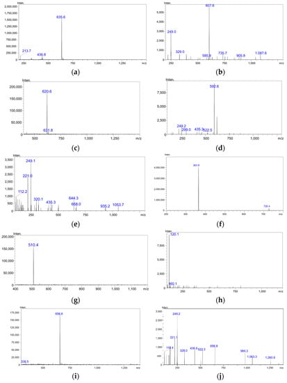 Under the positive ESI conditions, goserelin produced a predominantly protonated molecule [M + 2H]2+ at m/z 635.60 (Figure 3a), buserelin produced a protonated molecule [M + 2H]2+ at m/z 620.60 (Figure 3c), triptorelin produced a protonated molecule [M + 2H]2+ at m/z 656.50 (Figure 3j), and octreotide produced a protonated molecule [M + 2H]2+ at m/z 510.40 (Figure 3h) in full-scan mass spectra. All four peptides showed intense double-protonated molecular ions. These ions were chosen as the precursor ions for a further search of product ions in order to develop a MRM mode analysis. Formic acid, the dynamic modifier for the mobile phase, was shown to improve the analyte ionization efficacy. Thus, a mobile phase consisting of 0.1% v/v formic acid aqueous solution (solvent A) and 0.1% v/v formic acid acetonitrile solution (solvent B) was used for further method development and validation. Product ions produced after precursor ion fragmentation were then analyzed during the MS/MS optimization process. Fragment ions at m/z 607.60 (for goserelin), m/z 249.10, and 592.0 (for buserelin) and m/z 248.95 (for triptorelin) and m/z 120.05 (for octreotide) showed the highest intensity in mass spectra. The mass spectra for each analyte are given in Figure 3.