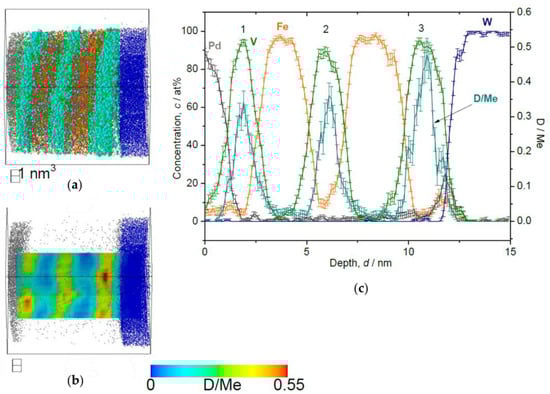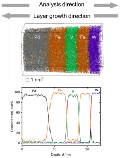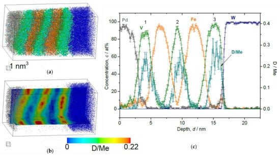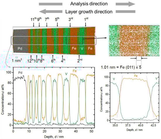 The local chemistry at the Fe/V interface is one of our interests in this study, particularly regarding its relationship to the D concentration profile. For epitaxial growth of hetero-structures, deposition at high temperature is often conducted to obtain smooth interfaces [30]. In this study, sputter deposition of Fe/V multi-layer was carried out also at a high temperature, 603 K, as a trial. An APT reconstruction result of a thickness-variated Fe/V multi-layered stack deposited at 603 K is shown in Figure 1, together with the depth concentration profile taken from a 5 nm ϕ cylinder volume.