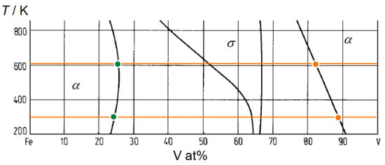 - Ivanchenko, V. Fe-V (Iron-Vanadium) Phase Diagram Crystal Structure. Landolt Börnstein 2008, Group IV/5. [Google Scholar] [CrossRef]