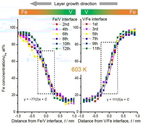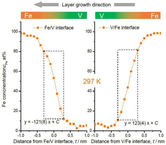In Figure 4, some changes in the concentration slope can be seen between the 2nd and the 6th Fe/V interface. However, there is no systematic change in the slope in the course of deposition even at the high temperature of 603 K. Therefore, interdiffusion processes solely cannot be convincingly attributed for the explanation. We should note that the field evaporation sequence in atom probing can also be affected by local chemistry via modification of the field evaporation strength EF. The change in EF sometimes induces a significant deviation from the original position of atoms. In this case, special care must be taken by examining the interface of two different layers [32,33,34]. Indeed, the EF of Fe2+ (30 V/nm) is slightly lower than that of V2+ (33 V/nm) [3], which leads to preferential evaporation of Fe while retarding the evaporation of V at a given field. This possibly causes reduced Fe concentration in an evaporation sequence of Fe layer V layer at its transition. This might explain the slight asymmetry of the concentration slope for both at 603 K and 297 K; the intermixing at the V/Fe sequence is less pronounced than that at the Fe/V sequence. However, the slope of cFe at Fe/V interface is considerably steeper in 297 K compared to 603 K (compare Figure 4 and Figure 5). This clearly indicates the impact of the deposition temperature, apart from the sole impact of the EF difference. In addition, as the films were prepared by sputter deposition, the origin of this asymmetry may be associated with sputter induced implantation and recoil phenomena as discussed below.