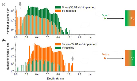 SRIM simulation results of implantation depths and recoil distributions, for V in Fe (a) and Fe in V (b). Note significant recoil of Fe and deeper penetration depth of Fe than that of V (indicated by grey arrows).