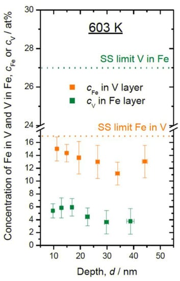 Consequently, the layer composition of the sample deposited at 603 K is also affected by the sputtering process. In Figure 7, the in-layer compositions are plotted for the film deposited at 603 K, together with the solid solubility limit (SS limit) at the same temperature. Slightly gradual slopes of in-layer Fe concentration (cFe) and V concentration (cV) along the deposition direction suggest the trace of recoiled atoms and high degree of alloying at 603 K.