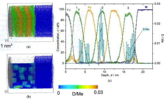 Following the solubility difference factor k, D atoms were detected mainly in V layers, but not in Pd or W (cH in Pd/cH in V = 10−4, cH in W/cH in V = 10−24 [26]). The detected deuterium concentration (cD) was alternatively verified by an EMF curve of similarly grown Fe/V ML films. It should be noted that the EMF is taken for H, and slight differences for the two isotopes H and D, are neglected, here. At low D2 pressure of 0.05 Pa, we expect the sample to be in the α-phase (deuterium solid solution phase) with cD = 0.035 D/Me, according to the EMF curve (cf. [24] or Figure 13). The result of the 3D reconstruction, the iso-concentration map and the depth profile of this sample are shown in Figure 8. The dots shown in Figure 8a,b are individual ions. The color map shown in (b) overlaid on the ion map indicate the cD as molar ratio of D/Metal (D/Me) within a defined cube of 2 nm side lengths. The average cD of 0.013(4) D/Me was found in the 2nd V layer. This value is only 1/3 of the value expected from the EMF-curve. This can be explained by D trapping at defects which is included in the EMF curve [38,39]. The related EMF curve (later shown in Figure 13) deviates non-linearly from the Sieverts’ relationship (a slope of RT/F), at low concentrations. This leads to higher mean contents of deuterium in the sample. However, if no dislocation exists in the targeted volume of the APT measurement and thus no considerable trapping is expected, the cD at 0.05 Pa should almost follow the Sieverts’ law. Then, the expected concentration would be approximately cD = 0.02 D/Me, at 0.05 Pa. This value roughly meets the APT value.