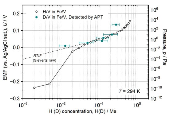 We now summarize the results of those deuterium concentrations cD at different D2 pressures obtained by APT, comparing the corresponding EMF curves. Both results are summarized in Table 1 and plotted in Figure 13. All APT data points were recorded at the analysis temperature of 30 K and the mean D concentration cD in the 2nd V layer from individual results are listed.