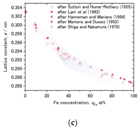 - Sutton, A.L.; Hume-Rothery, W. CXLI. The Lattice Spacings of Solid Solutions of Titanium, Vanadium, Chromium, Manganese, Cobalt and Nickel in α-Iron. Lond. Edinb. Dublin Philos. Mag. J. Sci. 2010, 46, 1295–1309. [Google Scholar] [CrossRef]