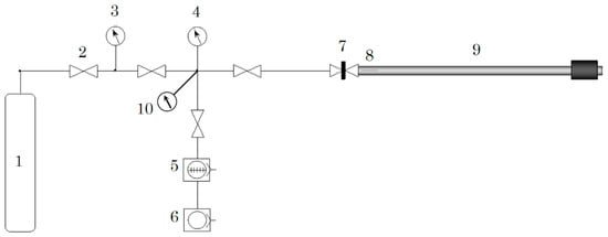 Schematic illustration of the home-made deuterium gas loading set up. 1: D2 gas bottle (99.98%), 2: variable leak valve, 3: capacitance manometer 105 Pa max., 4: capacitance manometer 100 Pa max., 5: turbo molecular pump, 6: oil rotary pump, 7: gate valve, 8: sample mounted on transfer rod, 9: magnetic transfer rod with sample, and 10: vacuum gauge.