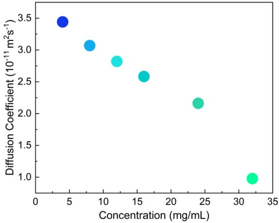 DOSY experiments were used to explore the flowability of the polymers in CDCl3 at different concentrations [51]. The diffusion coefficients of PPMU solutions over concentration range from 4 mg/mL to 32 mg/mL were recorded in Figure 2. It was clear that as the concentrations increased from 4 mg/mL to 32 mg/mL, the diffusion coefficients of the polymer solutions decreased gradually from 3 × 10−11 m2 s−1 to less than 1 × 10−11 m2 s−1. On the basis of the phenomenon that mobility was inversely proportional to concentration, these closer PPMU polymer chains in the high concentrations might prompt more non-covalent crosslinking through hydrogen bonds between the UPy units. SPNs exhibited lower mobility compared with the linear polymer chains capable of free movement.