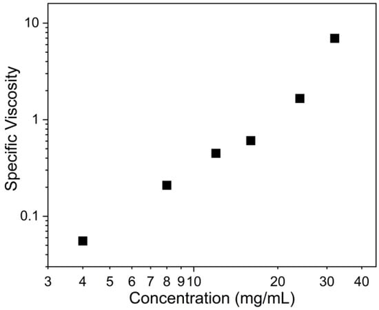 Then, we tried to discover how the viscosities of PPMU solutions change with increasing concentrations as a way of demonstration of SPNs formation [49]. An Ubbelohde viscometer was used to determine the data and to clarify the flow resistance of the polymer solutions at various concentrations. As shown in Figure 3, the special viscosities of the PPMU solutions at a concentration of 32 mg/mL was approximately ten times higher than the solutions at 4 mg/mL, and the viscosities rose with the increasing concentrations in the determination process. The rise in flow resistance of the PPMU solutions reflected the microstructure evolved from polymer chains to SPNs since the increasing crosslinking degree of the polymer solutions caused the difficulties in the flow process.