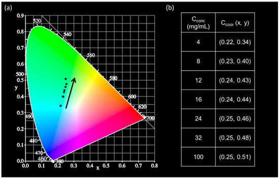 In addition, the consistent approach of CIE chromaticity coordinate diagram (Figure 5a) was adopted, providing the corresponding CIE coordinates of the solutions at different concentrations. Looking in the direction indicated by the black arrow, the locations of CIE coordinates moved to the upper right corner gradually with the increasing concentrations, whose corresponding colors coincided with what human eye perceives. The detailed CIE coordinates affected by the concentrations are listed in Figure 5b, and on it, it can be found that the value x increased from 0.22 to 0.25, while the value y increased from 0.34 to 0.51.