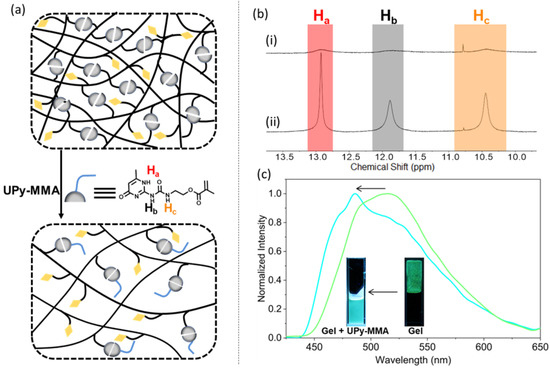 Stimuli-responsiveness is regarded as one of symbolic properties of SPNs. To demonstrate the significant characteristic, UPy-MMA monomers were added to the prepared SPNs. We anticipated that the wandering UPy-MMA molecules participated in the interactions between the UPy units of the polymer chains as strong competitors. The UPy units of PPMU chains in the original dimerization turned to form hydrogen bonds with the free UPy-MMA molecules, leading to the disassociation of SPNs with the reduced hydrogen bonding sites between polymer chains (Figure 6a) [52]. The 1H NMR spectra of SPNs before (Figure 6bi) and after (Figure 6bii) the addition of the UPy-MMA monomers were given to support the hypothesis. It could be found that the intensity of the proton signal of Ha, Hb, Hc, owned by the UPy structures, were lower than the solutions fixed with free UPy-MMA molecules. Furthermore, all of the three signals varied from broad peaks to narrow peaks after the addition. Both of the changes suggested the hydrogen bonds for the construction of SPNs had been destroyed by the excessive UPy-MMA monomers. As shown in Figure 6c, the green gel referring to SPNs of high crosslinking degree, suffering from the damage of the hydrogen bonds between the polymer chains, transformed to the blue liquid on behalf of SPNs of low crosslinking degree. The fluorescent spectra of the solutions before and after treated with the stimulus are shown in Figure 6c as well, being surprisingly in agreement with the color change. There was a blue shift between the maximum emission wavelengths of SPNs from 515 nm to 485 nm.
