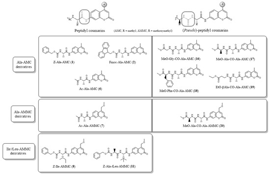 Amino acyl (compounds 1, 2, 6–8) and (pseudo)-dipeptidyl (11, 16–20) derivatives of 4-methyl (AMC)- and 4-methoxymethyl (AMMC)-substituted 7-amino-coumarins.