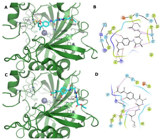 Docked poses of ligand 19 (stick, cyan C atoms) in the Z (panel (A)) and E (panel (C)) hydrolyzed forms complexed to hCA XII (dark green cartoon). The most relevant residues are represented as lines. Corresponding 2D ligand interaction diagrams are reported in panels (B,D), respectively.
