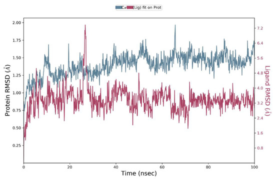 RMSD evolution during the MD simulation of the protein (light blue, calculated on the C-alpha, left Y-axis) and the ligand (compound 19) (purple, calculated on all atoms, right Y-axis).
