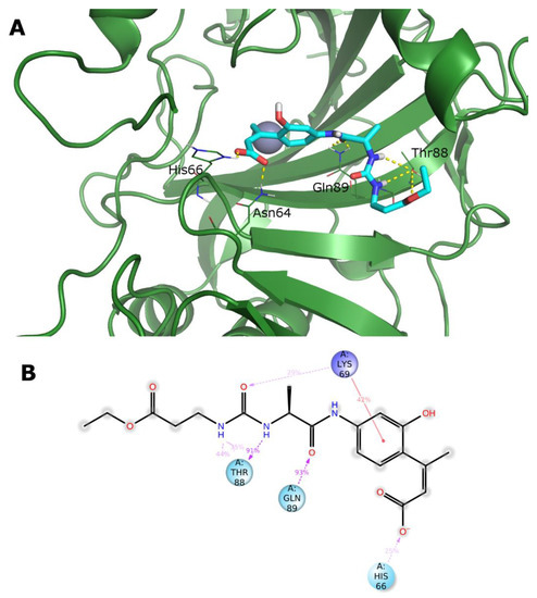 The carboxylic function can alternatively bind to His66, in a more extended conformation or to Lys69 in a bent geometry. Additionally, the latter residue forms a relatively stable cation-π contact with the aromatic ring of the hydroxycinnamic acid and an H-bond with urea carbonyl oxygen. The high stability of H-bonding contacts to Thr88 and Gln89 makes these latter the anchoring residues with a persistence of 90% during the simulation (Figure 4B). The stability of these H-bonds which involves the urea internal NH and the other polar contacts formed by the distal NH and the carbonyl oxygen, can contribute to explaining the better activity profile shown by (pseudo)-dipeptidyl derivatives with respect to amino acyl derivatives toward hCA XII.