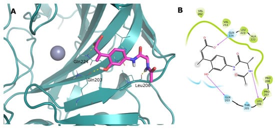 (A) Docked pose of ligand 6 (stick, magenta C atoms) in the hydrolyzed Z form in the hCA IX binding site (cartoon, dark cyan). (B) Corresponding 2D ligand interaction diagram.