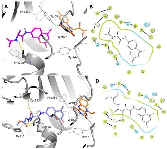 The docking poses in the hMAO-A pocket show coumarins 6 and 16 enclosed within the hydrophobic portion produced by the FAD and residues Tyr407, Tyr444, Phe352, and Tyr69. Furthermore, the terminal amide NH of 6 forms an H-bond with the carbonyl oxygen of Phe208, whereas three H-bonds stabilize compound 7: the urea NH with the carbonyl oxygen of Ala111, the urea C=O with the thiol of Cys32, and the terminal carbonyl with the NH of Val210 (Figure 6).