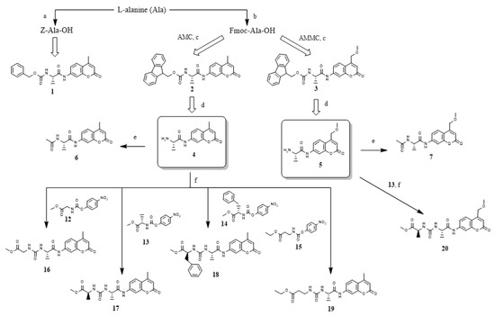 Synthetic route to Ala-AMC/Ala-AMMC derivatives. Reagents and conditions: (a) Z-Cl, 1 N NaOH, 0 °C, 2 h, then r.t., 16 h; (b) Fmoc-OSu, TEA, H2O/THF (2:1), r.t., 4 h; (c) IBCF, TEA, dry THF, −10 °C under N2, 1 h, then r.t., 24 h; (d) DBU, dry DCM, r.t., 15 min; (e) Ac2O, AcOH, r.t., 21 h; (f) DMAP, dry DMF, r.t., 72 h.