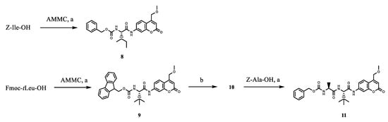 The preparation of dipeptidyl coumarin 11 was accomplished by starting from 9, which was easily N-deprotected by DBU to afford compound 10. Subsequent acylation was conducted following the mixed anhydride strategy with IBCF-activated Z-Ala-OH, resulting in satisfactory yields of 11.