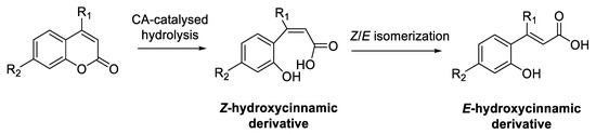 hCA-mediated hydrolysis of coumarin derivatives and successive Z/E isomerization.