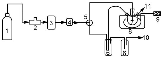 A schematic diagram of the ozonation system is shown in Figure 1. A three-necked 250 mL round-bottomed flask was used as an ozonation reactor for the desulfurization experiments. The middle neck connected with a gas disperser through which ozone was introduced into the reaction solution at a constant rate. One of the two side necks connected with a water-cooled reflux condenser to prevent reaction solution loss and to serve as a gas outlet, and the residual ozone in the outlet gas was adsorbed by KI solution. The other was closed with a glass stopper. After 60 mL of simulated diesel and 60 mL of acetonitrile were added to the flask, the catalyst was added to the above mixture, and then ozone was bubbled up into the mixture. Sonication was performed with a KQ-100 KDB ultrasonic generator (100 W, 20 kHz, Kunshan Ultrasonic Instrument Co., Ltd., Suzhou, China). The flask was immersed into the ultrasonic batch, inside which a temperature control system was placed to keep a certain temperature, and a low temperature was achieved by adding ice to the ultrasonic batch. During the reactions, the upper n-octane phase of the reaction mixture was periodically withdrawn and determined for sulfur content using a Model WK-2E microcoulometric integrated analyzer (Jiangsu Jiang Fen Electroanalytical Instrument Co., Ltd., Taizhou, China).