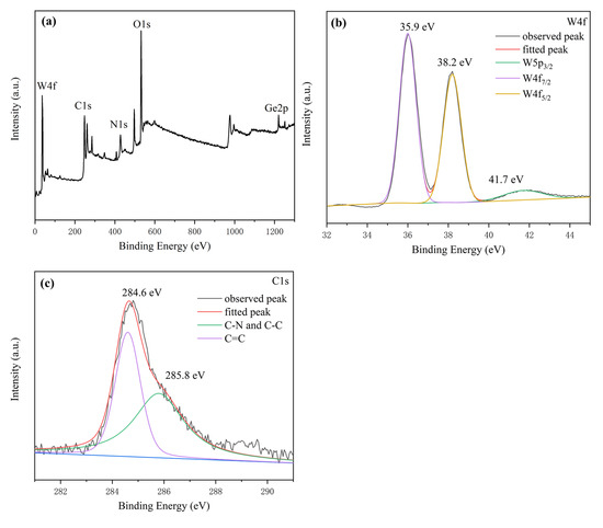 The XPS spectra of H4GeW12O40 are shown in Figure 4, and the high-resolution spectra of W 4f and C 1s were fitted. The W4f high-resolution spectra were fitted with three typical peaks at 35.9 eV, 38.2 eV, and 41.7 eV, corresponding to W 4f7/2, W 4f5/2, and W 5p3/2, respectively. Two single peaks exist in the C 1s high-resolution spectra, corresponding to C=C (284.6 eV), C-N, and C-C (285.8 eV). The measured results are essentially the same as the peak positions of the XPS spectra of [GeW12O40]4− anion in other literature [26], further suggesting that H4GeW12O40 has a Keggin-type structure.