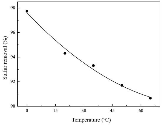 Temperature has a significant effect on DBT removal. From the results shown in Figure 6, it was evident that desulfurization efficiency decreased with the increase in temperature. At lower temperatures, such as at 0 °C, the desulfurization efficiency was 98.1% for a 60 min reaction, while with the temperature increased to 65 °C, the desulfurization efficiency decreased to 90.7%. The increase in temperature can influence the catalytic ozonation process in two ways: (1) the concentration of ozone in solution is reduced; (2) the diffusion rate of the reacting substances is enhanced. The efficiency decrease in DBT removal from 0 to 65 °C may demonstrate that (1) is predominant. Therefore, 0 °C can be recommended as the ideal temperature in this paper.