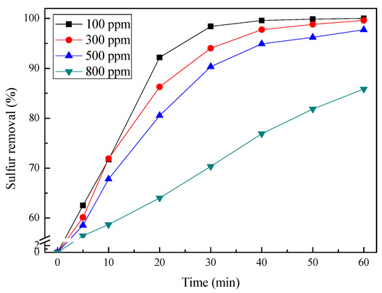 Another significant factor for sulfur removal is the initial sulfur concentration, which was investigated using different concentrations (100, 300, 500, and 800 ppm). The results are shown in Figure 8. An increase in the initial sulfur concentration led to a remarkable decrease in the removal of DBT. When the initial sulfur concentration was 100 ppm, the conversion of DBT was up to 100% in 60 min, then as initial sulfur concentration increased to 300 ppm, 500 ppm, and further to 800 ppm, the desulfurization efficiency was found to decrease from 99.6% to 98.1%, and further to 85.9%, corresponding to 1.2 ppm, 10.0 ppm, and 112.8 ppm, respectively. This phenomenon indicated that DBT removal depends on its initial concentration, which may be caused by the decrease in catalytic active sites. As the initial concentration of DBT increased, more DBT molecules were absorbed into the catalyst. Thus, an increase in the amount of substrates accommodating the catalyst inhibits the action of the catalyst with O3. Therefore, the desulfurization efficiency decreased.