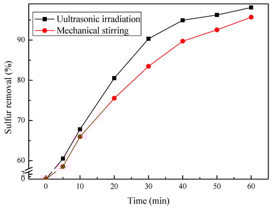 Ultrasonic irradiation can significantly enhance the reaction efficiency in chemical synthesis [30], since cavitation can be produced when mechanical vibrations are transmitted into the liquid as ultrasonic waves. In order to evaluate the effect of ultrasonic waves on the removal of DBT, a procedure applying the same previously optimized conditions was conducted, with a temperature of 0 °C, catalyst dosage of 2.5 wt.% of n-octane, and initial sulfur concentration of 500 ppm. However, mechanical stirring was employed instead of ultrasonic irradiation. The results are shown in Figure 9.