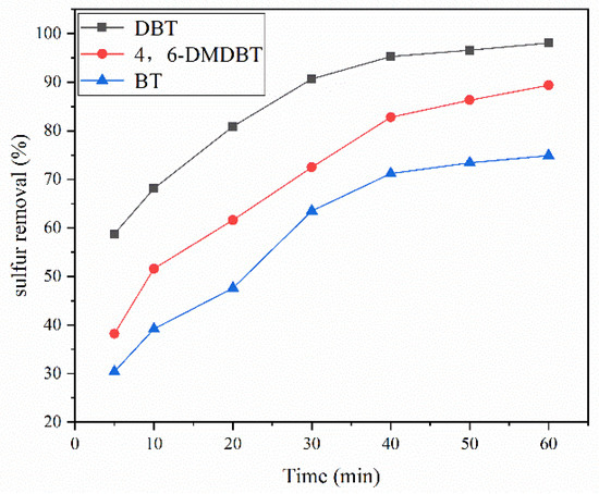To investigate the removal effect of HPMo on different sulfides, simulated diesel fuel with 500 ppm sulfur content of DBT, 4,6-DMDBT, and BT were configured to investigate the selectivity of the ODS system for different sulfides. As shown in Figure 10, the removal efficiencies of the sulfur compounds in the HPMo catalyst system were DBT > 4,6-DMDBT > BT. The reactivity of the thiophene sulfides was positively correlated with the electron cloud density of the sulfur atoms, which were 5.758, 5.760, and 5.739 for DBT, 4,6-DMDBT, and BT, respectively [31]. The low electron cloud density of the sulfur atoms of BT made it the most difficult of the three sulfides to remove, followed by 4,6-DMDBT, which was more difficult to remove than DBT, probably due to the greater steric effects of 4,6-DMDBT on the molecular methyl group.
