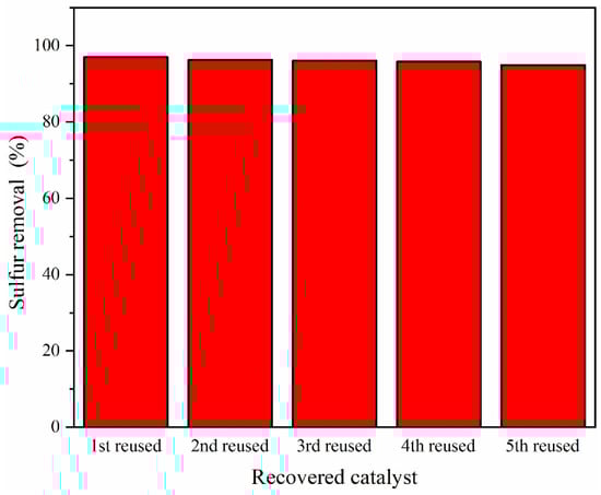 The catalytic effect of the used catalyst was explored and the recovering process was performed according to the method reported by Zhang et al. [32]. After completion of the reaction, the reaction mixture was kept still for 20 min. Then, the acetonitrile phase including the catalyst was separated and distilled to recover acetonitrile by cooling at the top of the distillation column. Water was added to the residue in the evaporator, and then, adding diethyl ether to the above mixture, HPMo was extracted into the diethyl ether phase. HPMo was recovered by further evaporation of diethyl ether. Evaluated through five recovery-reusing runs, the recovered HPMo catalyst was found to demonstrate excellent catalytic performance (Figure 11). The reused catalysts achieved 97%, 96.3%, 96.1%, 95.8%, and 94.9% DBT conversions in the first, second, third, fourth and fifth ODS cycles, respectively.
