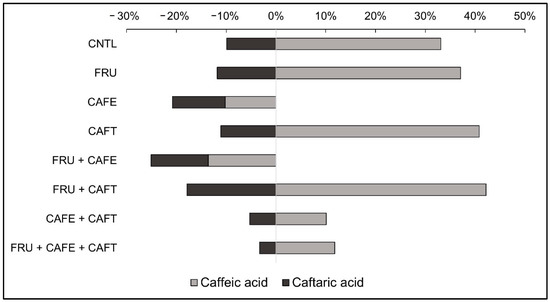 Percent difference in caffeic and caftaric acid concentrations between 30 °C and 15 °C temperature conditions after 90-days of storage. Percentage difference calculated as follows: |A − B|/[(A + B)/2] × 100%, where A is the compound concentration determined for the 30 °C sample, and B is the concentration determined for the 15 °C sample. +X% is interpreted as a relatively greater concentration determined at 30 °C compared to 15 °C, while −X% is interpreted as a relatively lower concentration. Treatment codes: CNTL (no addition), FRU (6 g/L fructose), CAFE (5 mg/L caffeic acid), CAFT (5 mg/L caftaric acid), FRU + CAFE (6 g/L fructose + 5 mg/L caffeic acid), FRU + CAFT (6 g/L fructose + 5 mg/L caftaric acid), CAFE + CAFT (5 mg/L caffeic acid + 5 mg/L caftaric acid), and FRU + CAFE + CAFT (6 g/L fructose + 5 mg/L caffeic acid + 5 mg/L caftaric acid).