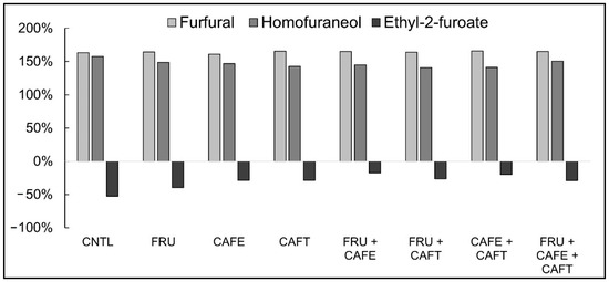 Percent difference between furan-derived compound concentrations stored at 30 °C and 15 °C for 90-days. Percent difference was calculated as follows: |A − B|/[(A + B)/2] × 100%, where A is the compound concentration determined for the 30 °C sample, and B is the concentration determined for the 15 °C sample. +X% is interpreted as a greater concentration determined at 30 °C compared to 15 °C, while −X% is interpreted as a lower concentration. Treatment codes: CNTL (no addition), FRU (6 g/L fructose), CAFE (5 mg/L caffeic acid), CAFT (5 mg/L caftaric acid), FRU + CAFE (6 g/L fructose + 5 mg/L caffeic acid), FRU + CAFT (6 g/L fructose + 5 mg/L caftaric acid), CAFE + CAFT (5 mg/L caffeic acid + 5 mg/L caftaric acid), and FRU + CAFE + CAFT (6 g/L fructose + 5 mg/L caffeic acid + 5 mg/L caftaric acid).