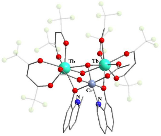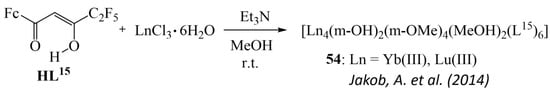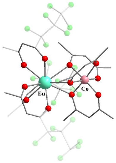 The co-crystallization of β-diketonates with various metal ions is known as one of the available methods for the synthesis of heterometallic compounds with both discrete and polymer coordination structures. For example, Lindoy et al. described the heterometallic complex [Eu-Co] (11) based on 3d and 4f metal β-diketonates: the stoichiometric structure was formed from two β-diketonates containing europium(III) and cobalt(III) in a CDCl3 solution (Scheme 5) [65]. In this case, oxygen atoms of non-fluorinated β-diketonate acted as bridging atoms between two metal ions (Figure 3).
