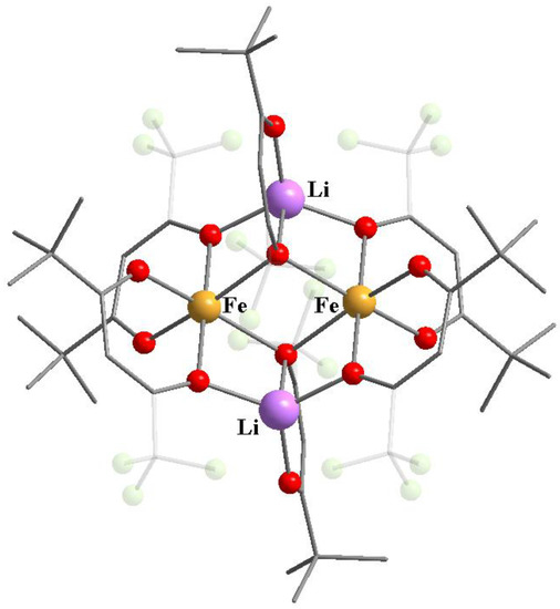 The reaction of the iron(II) chloride and the fluorinated lithium β-diketonate led to a tetranuclear heterometallic complex [Li-Fe(II)] (12) (Scheme 6) [66]. The resulting iron(II) bis-β-diketonates were coordinated with two molecules of the initial lithium β-diketonate (Figure 4). The coordination environment of metal centers [LiO5] and [FeO6] consisted only of the oxygen atoms of β-diketonate anions without involving the fluorine atoms.