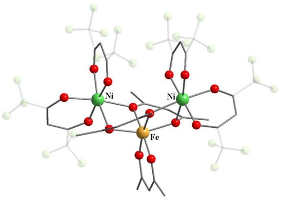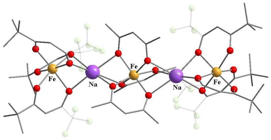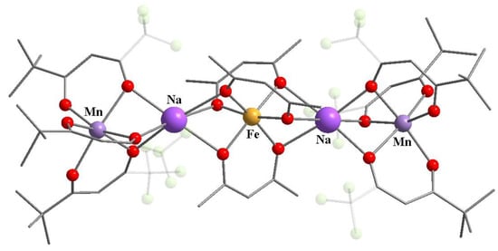 The co-crystallization of two 3d β-diketonates with metals in different oxidation states resulted in [FeIII(acac)3][MnII(hfac)2] (18) and [NiII(hfac)2][FeIII(acac)3][NiII(hfac)2] (19) (Scheme 8) [69]. Similarly to heterometallic complexes 13–17, fluorinated β-diketonate was coordinated to a metal ion with the lowest oxidation number. In the structures of 18, 19 the oxygens of non-fluorinated β-diketonate were bridging atoms, which filled the coordination sphere of Mn(II) or Ni(II) ions coordinating the hfac (Figure 8 and Figure 9). Authors have postulated that the transition metal(II) center participating in bridging interactions with oxygen atoms of neighboring unit(s) should be highly Lewis acidic because of the chelation by diketonates with electron-withdrawing groups. In contrast, the transition metal(III) counterpart should have sterically uncongested ligands with electron-donating substituents provoking diketonate oxygen atoms’ involvement in bridging interactions with the M(II) center.