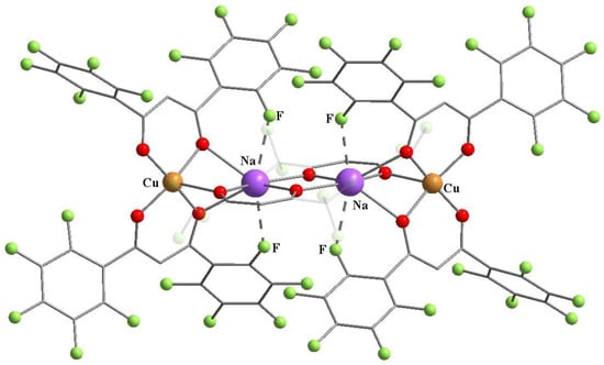 Dikarev et al. described the first example of the heterometallic [Na-Cu] complex (22) resulting from two different fluorinated β-diketonates [64]. The reaction of unsolvated [Cu(L14)] and Na(hfac) gave a heterometallic β-diketonate [Na2Cu2(pfbm)4(hfac)2] (22) (Scheme 10). The discrete structure of the solvent-free [Na-Cu] environment consisted of a dimeric [Na2(hfac)2] unit surrounded by two Cu(pfbm)2 fragments (Figure 11). β-diketonates adopted the chelating-bridging mode between Cu and Na by coordinating through one oxygen atom in the case of F-aryl-containing ligands and two oxygen atoms in the case of hfac anions. The overall distorted square antiprismatic coordination environment for Na was formed by the five primary Na–O interactions (av. 2.41 Å) and three secondary Na–F contacts (av. 2.60 Å).