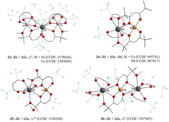 The methoxy substituent in thd, L9, L10, participated in the additional coordination with metal ions during the formation of polynuclear structures [71,72,73]. The co-crystallization of two different β-diketonates led to the discrete heterometallic complexes, e.g., [Pb-M] (23–26) (Figure 12). The thd is the unique structure because it contains a sterically bulky group close to the β-dicarbonyl fragment that is a necessary condition for the synthesis of discrete heterometallic complexes. If this does not happen, then coordination [Pb-Cu] polymers are formed in the absence of methoxy substituents at the β-dicarbonyl fragment [73,74]. In polymeric fluorinated [Pb-Cu] structures 23–26, the square planar chelate Cu(dik)2 built up an octahedral coordination environment due to the bridging oxygen atoms of the ligands from Pb(hfac)2 moieties.