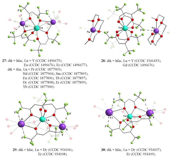Biheterometallic tetrakis-β-diketonates can form both the discrete or polymer structures depending on the nature of the substituents in β-diketonate and coligands [78,79,80,81,82,83,84,85]. In the polymer chains 27–30, alkali metal ions, including sodium, potassium and cesium, acted as linkers between two adjacent tetrakis-β-diketonate fragments (Figure 13) [78,79,80,81]. In this case, both the oxygen and fluorine atoms of the β-diketonate were coordinated to alkali metals. A polyether molecule can be used as a polydentate coligand to fill the coordination environment of the alkali metal ion (28) [80]. The complexes Na[Ln(hfac)4] (27) were found to be highly volatile and stable in the gas phase while preserving the heterometallic fragment. The decay of heterometallic [Ln-Na] complexes (27) under argon atmosphere yielded the phase-pure NaLnF4 [78]. Varying the decay temperature, the formation of one of the NaLnF4 allotropes can be controlled [78]. Another approach was to use two precursors [Na(hfac)(tetraglyme)] and [Ln(hfac)3(diglyme)] together in sol–gel synthesis of the hexagonal phase of β-NaYF4:Yb3+,Er3+ at an elevated temperature [84].