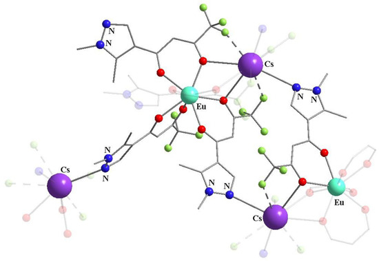 Diketone HL7 with a pyrazole substituent formed the crystal packing of the heterometallic [Eu-Cs] complex (31) due to the coordination of nitrogen atoms of the heterocyclic system with cesium ions (Figure 14) [82]. The coordination environment of cesium(I) ions is saturated by nitrogen atoms of pyrazole, fluorine atoms of CF3 groups and bridging oxygen atoms of diketonate anions. The contact length of Cs…F is ~3.21–3.44 Å, which is comparable with the bond length of Cs…N equal to ~3.17–3.20 Å.
