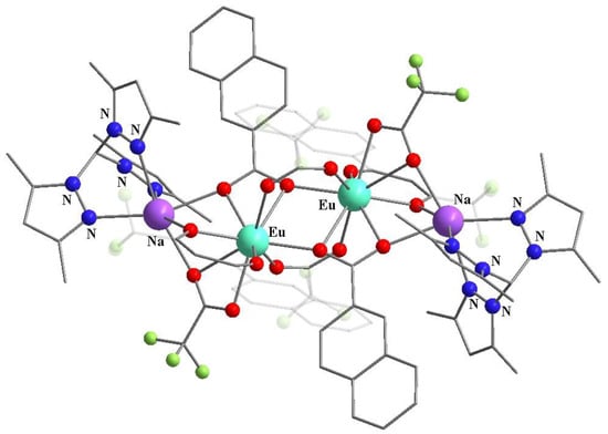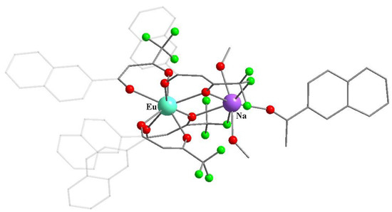 The complexation of ntfa with europium(III) chloride in the presence of sodium alkali in methanol gave the discrete [Eu-Na] tetrakis-β-diketonate (32) containing an acetyl naphthalene (Scheme 12) [83]. The aromatic ketone in the complex 32 indicates a side retro-Claisen reaction involving ntfa. Therefore, coligand contribution led to the change from polymer to discrete tetrakis-β-diketonates (Figure 15). Heterometallic complex 32 had good luminescent properties, exhibiting a phosphorescence time equal to 0.595 ms with a quantum yield of 47.5%. Photophysical parameters were measured under excitation at a wavelength of 370 nm in CH2Cl2 solution [83].