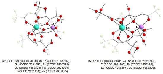 The second and the third types of complexes included the compounds 36, 37, in which the Ln(III) tris-β-diketonate fragment was coordinated to the initial lithium β-diketonate LiL10 (Scheme 13). The solvent choice (methanol or ethanol) influenced the coligands at the lithium ion in heterometallic complexes 36 (where Ln = Tb, Dy, Eu) (Figure 18). However, the main distinctive characteristic of these close structures was their different crystal packings. Complexes 36 (where Ln = Tb, Dy, Eu) exhibited mechanoluminescent properties, and one of them, [Dy-Li], was found to be a single-molecule magnet with an energy barrier equal to 53 K.