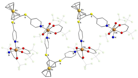 - Horikoshi, R.; Tominaga, T.; Mochida, T. Mixed-Metal Coordination Polymers and Molecular Squares Based on a Ferrocene-Containing Multidentate Ligand 1,2-Di(4-pyridylthio)ferrocene. Cryst. Growth Des. 2018, 18, 5089–5098. [Google Scholar] [CrossRef]