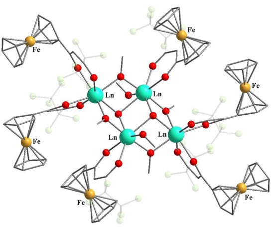 Molecular structure of 35 [87]. Hydrogen atoms, MeCN molecules have been omitted, CF3 groups are transparent for clarity. The cif has been retrieved from CCDC. CCDC numbers are 1973632 (Ln = Eu), 1973633 (Ln = Tb).