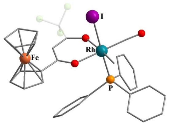 - Conradie, J.; Lamprecht, G.J.; Roodt, A.; Swarts, J.C. Kinetic study of the oxidative addition reaction between methyl iodide and [Rh(FcCOCHCOCF3)(CO)(PPh3)]: Structure of [Rh(FcCOCHCOCF3)(CO)(PPh3)(CH3)(I)]. Polyhedron 2007, 26, 5075–5087. [Google Scholar] [CrossRef]