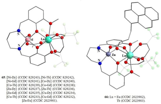 Molecular structures of Ln(III) tetrakis-diketonates 27–30 [78,79,80,81]. Hydrogen atoms and some CF3 groups have been omitted for clarity. The cifs has been retrieved from CCDC.