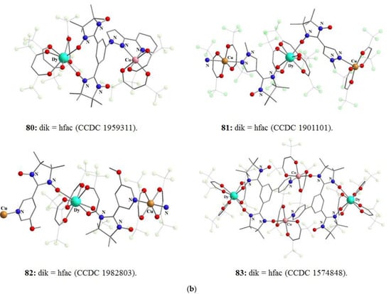 - Patrascu, A.A.; Briganti, M.; Soriano, S.; Calancea, S.; Allao Cassaro, R.A.; Totti, F.; Vaz, M.G.F.; Andruh, M. SMM Behavior Tuned by an Exchange Coupling LEGO Approach for Chimeric Compounds: First 2p-3d-4f Heterotrispin Complexes with Different Metal Ions Bridged by One Aminoxyl Group. Inorg. Chem. 2019, 58, 13090–13101. [Google Scholar] [CrossRef] [PubMed]