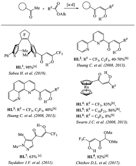 In this part, we show the approaches to the original fluorinated β-diketones, which were further used in the synthesis of heterometallic complexes. The Claisen condensation is known as the main synthetic method for the preparation of fluorinated β-diketones. The most frequently used condensing agents are NaH [31,32,33,34,35] and MeONa [36,37,38,39,40,41,42,43], while LiH [44,45,46,47,48], LDA [49] and Na [50] are less demanded. Ethers (DME, Et2O, THF) are more preferred solvents rather than benzene or alcohols. The synthesis of functionalized ligands incorporating the β-dicarbonyl fragment and fluorinated groups is shown in Scheme 1 [51,52,53,54,55,56,57]. In this case, the condensation proceeds between the fluorine-containing esters and methyl ketones bearing an aryl, hetaryl substituent or a functional group.