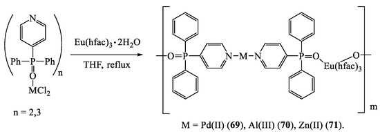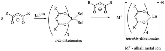 In general, the reaction of β-diketones with lanthanide(III) salts leads to the substitution of halide, carboxylate and nitrate anions of metals with a β-diketonate anion. The coordination of transition trivalent 4f-metals with two or three β-diketonate anions provided the discrete neutral complexes [M(dik)3(coligand)2] (Scheme 11) [25,29,32,33,39,75,76,77]. However, the metal ion was additionally coordinated to the solvent molecules or bidentate ligands having the donor heteroatoms (oxygen, nitrogen). At the next step, the metal(III) tetrakis-β-diketonates containing the anionic part of [M(dik)3]− or [M(dik)4]−,were formed as a result of the β-diketonate anion addition to the central metal atom in neutral tris-β-diketonates.