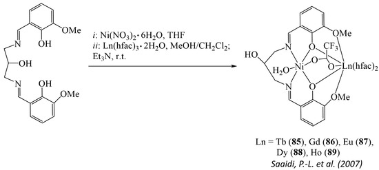 - Lin, J.; Yue, L.; Xin, L.; Jinlei, T.; Shiping, Y. Three series of heterometallic NiII-LnIII Schiff base complexes: Synthesis, crystal structures and magnetic characterization. Dalton Trans. 2017, 46, 12558–12573. [Google Scholar] [CrossRef]