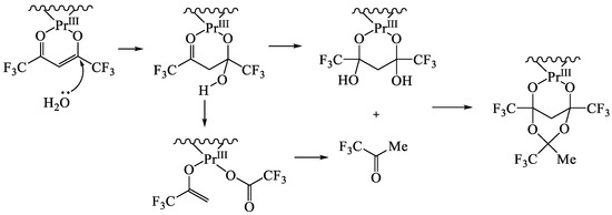 - Wang, S.; Pang, Z.; Smith, K.D.L.; Hua, Y.-S.; Deslippe, C.; Wagner, M.J. Decomposition and Cycloaddition Reactions of hfacac, and Syntheses and Structures of LnIII2(hfacac)4(bdmap)2(H2O)2(THF)2, LnIIICuII(bdmapH)2(hfacac)2(O2CCF3)L, LnIIICuII2(hfacac)(bdmap)3(O2CCH3)2(O2CCF3)(hfacacH) (Ln = Y, Pr, Nd; hfacac = hexafluoroacetylacetonato; bdmap = 1,3-bis(dimethylamino)-2-propanolato; L = 2-methyl-2,4,6-tris(trifluoromethyl)-1,3-dioxane-4,6-diolato). Inorg. Chem. 1995, 34, 908–917. [Google Scholar] [CrossRef]